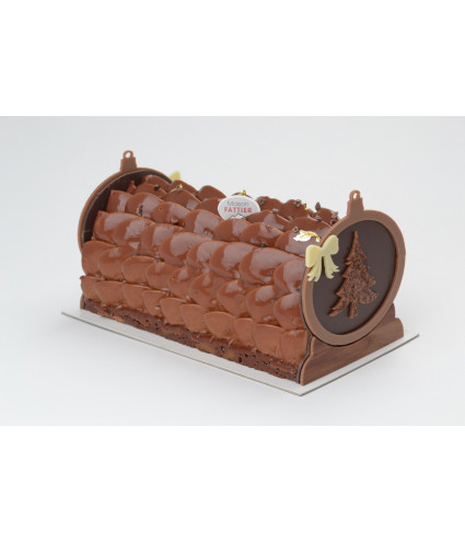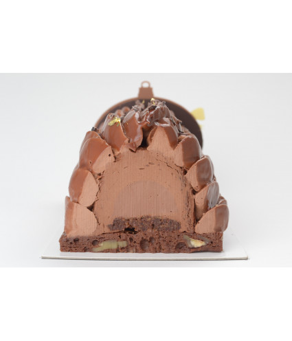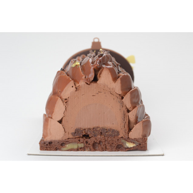 Un biscuit brownie fondant aux noix de pécan torréfiées, un crémeux chocolat Macaé 62% velouté, une mousse chocolat Guanaja 70% profonde et intense, le tout relevé par un praliné amande grué de cacao pour une touche croquante et gourmande. Une bûche 100% chocolat, riche en saveurs et en textures, pour les amateurs de cacao puissant.