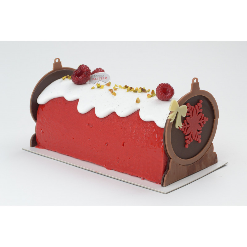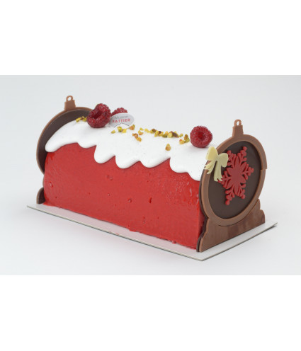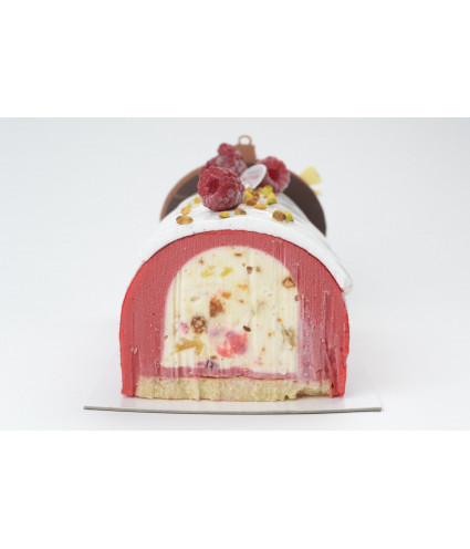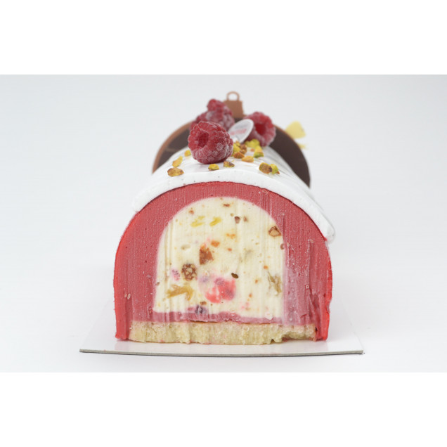 Un sorbet framboise maison intense et fruité, un nougat glacé crémeux aux éclats de nougatine croustillante et aux brisures de framboise, le tout posé sur un biscuit aux amandes sans gluten. Une bûche glacée qui allie fraîcheur acidulée, douceur onctueuse et croquant gourmand, pour un dessert vibrant et élégant.