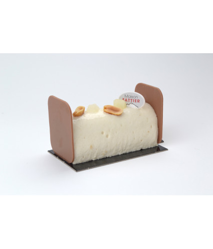 Un biscuit chocolat fondant, une gelée de citron vive et parfumée, un croustillant cacahuète généreux, une compotée de poire subtilement citronnée et une mousse poire citron aérienne. Chaque bouchée offre un équilibre parfait entre douceur, acidité et croquant, pour une bûchette vegan aussi gourmande qu’élégante.