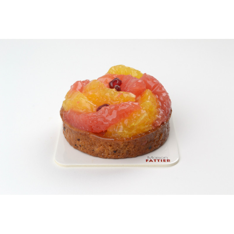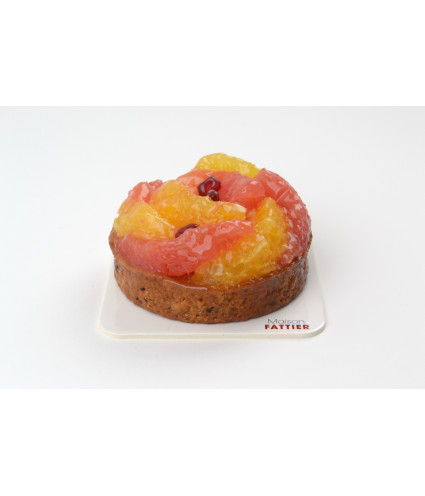 Pâte sucrée, crème amande pistache, ganache montée pistache, agrumes frais : orange, pamplemousse, citron vert, grenade