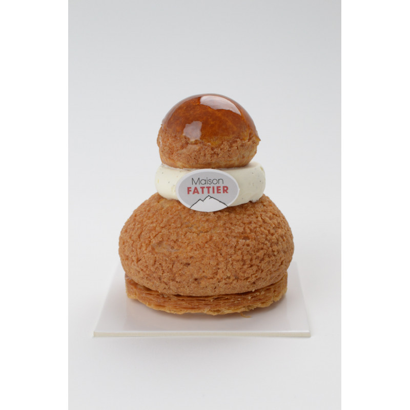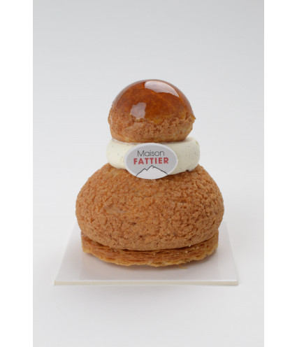 Composé d'un feuillage caramélisé, d'une pâte à chou garnie d'une crème pâtissière à la vanille de Madagascar allégée, d'un caramel tendre et d'une chantilly mascarpone vanille de Madagascar.