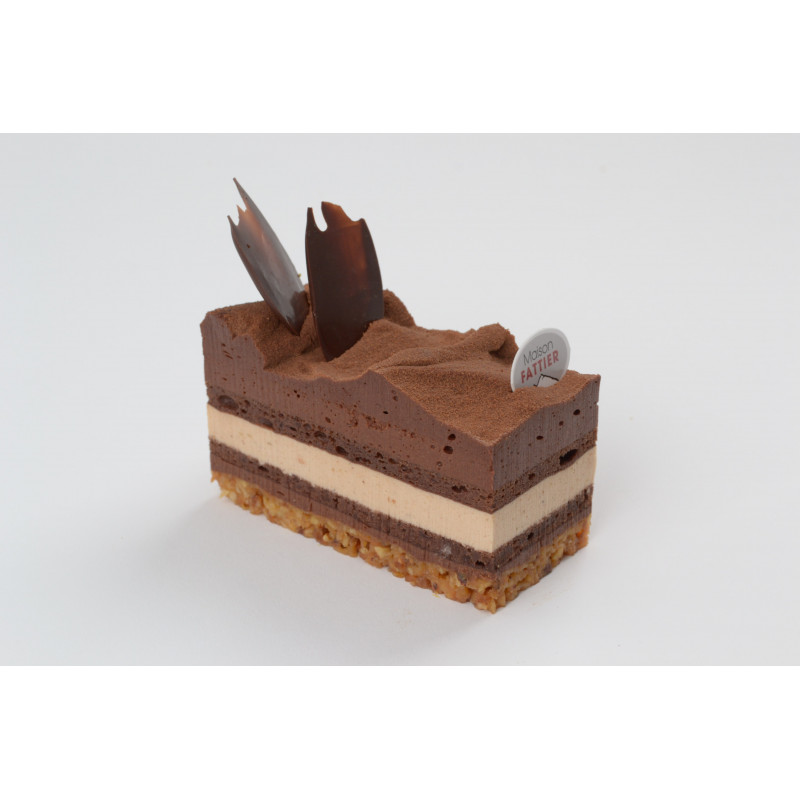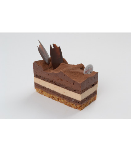 Croustillant gourmand noisettes et amandes à la fleur de sel, biscuit au chocolat noir, un délicieux crémeux chocolat lait noisette, surmonté d'une mousse chocolat noir à l'alcool d'orange.