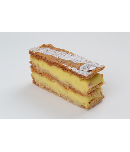 Délicieux millefeuille confectionné à partir d'une pâte feuilletée croustillante pur beurre AOP et d'une soyeuse crème pâtissière à la vanille de Madagascar, parfumée au caramel beurre salé. Une fois goûté vous ne pourrez plus vous arrêter !