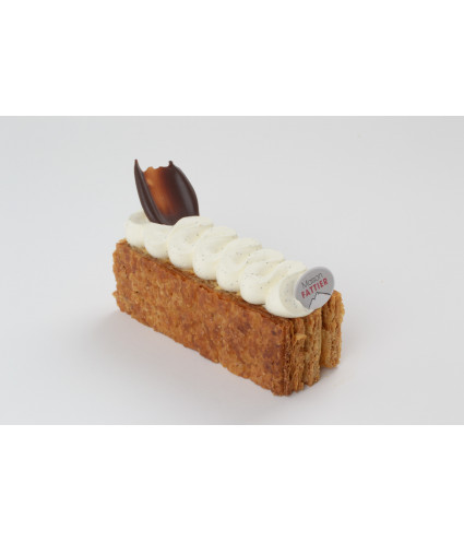 Délicieux millefeuille confectionné à partir d'une pâte feuilletée croustillante pur beurre AOP et d'une soyeuse crème pâtissière à la vanille de Madagascar, parfumée au caramel beurre salé. Une fois goûté vous ne pourrez plus vous arrêter !